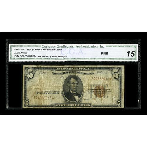 <B>Fr. 1850-F $5 1929 Federal Reserve Bank Note.CGA Fine 15.</B></I><BR>From what we can tell there seems to be no apparent manipulation to remove the overprint that listed the Atlanta Federal Reserve Bank name in black along with the four black district letters. In our opinion we feel this error certainly could have occurred. A tough error on an FRBN.<BR><BR><b>Shipping:</b> Coins & Currency (<a target="_blank" href="http://www.heritageauctions.com/common/shipping.php">view shipping information</a>)