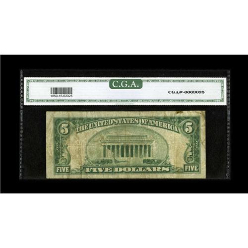 <B>Fr. 1850-F $5 1929 Federal Reserve Bank Note. CGA Fine 15.</B></I><BR>From what we can tell there seems to be no apparent manipulation to remove the overprint that listed the Atlanta Federal Reserve Bank name in black along with the four black district letters. In our opinion we feel this error certainly could have occurred. A tough error on an FRBN.