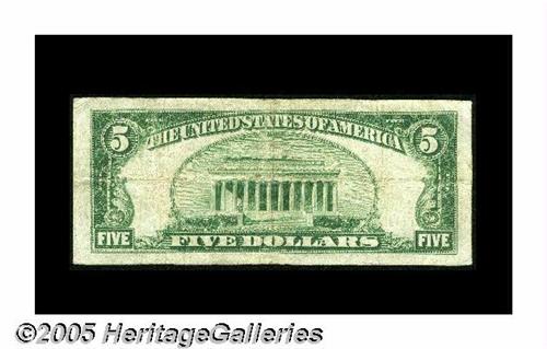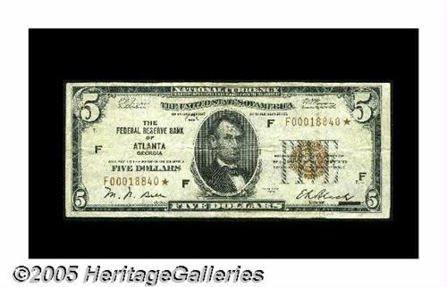 <B>Fr. 1850-F* $5 1929 Federal Reserve Bank Note. Fine-Very Fine.</B></I><BR>A nice evenly circulated example of this very much in-demand star. Just 24,000 of these stars were printed, with only about fifteen numbers recorded in the new Oakes FRBN monograph.