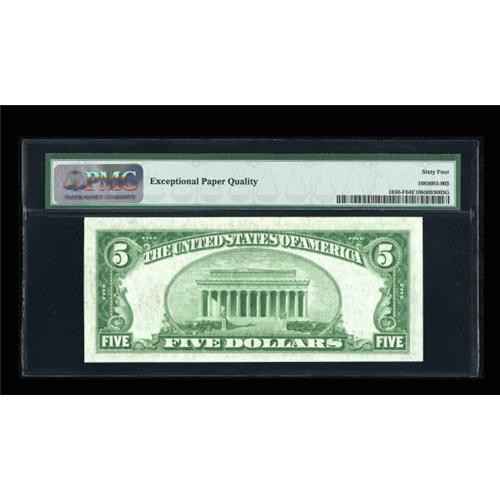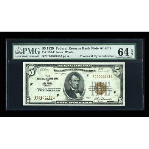 <B>Fr. 1850-F $5 1929 Federal Reserve Bank Note. PMG Choice Uncirculated 64 EPQ.</B></I><BR> A boldly printed Atlanta district example bearing neat low serial number F00000013A. <BR><I>From The Thomas M. Flynn Collection</B></I><BR><BR><b>Shipping:</b> Coins & Currency (<a target="_blank" href="http://www.heritageauctions.com/common/shipping.php">view shipping information</a>)