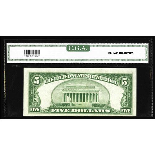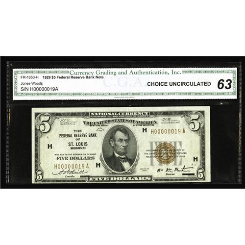 <B>Fr. 1850-H $5 1929 Federal Reserve Bank Note. CGA Choice Uncirculated 63.</B></I><BR>Second in rarity only to the San Francisco district $5, this St. Louis FRBN is a key to the series in this denomination and is almost always found well-worn and not in this state of preservation. Low serial number H00000019A also is quite attractive.