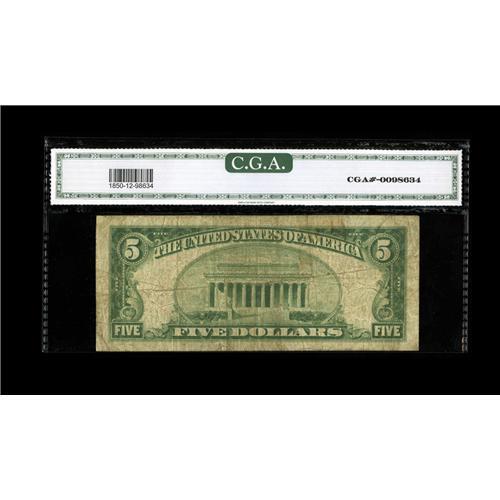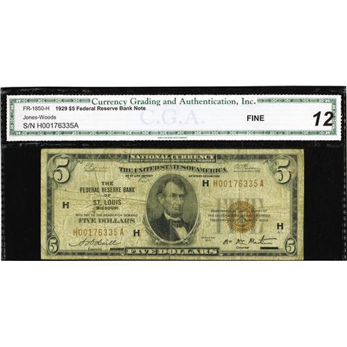 <B>Fr. 1850-H $5 1929 Federal Reserve Bank Note. CGA Fine 12.</B></I><BR>This is the second toughest $5 FRBN to acquire which is problem free.
