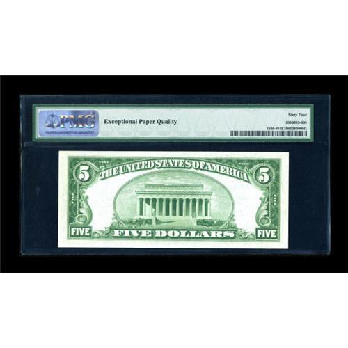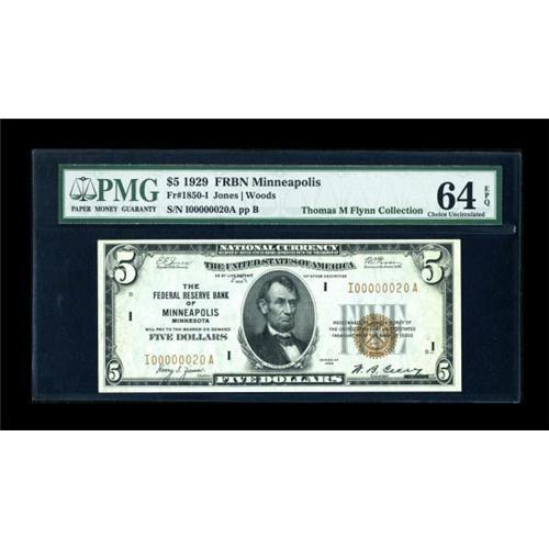 <B>Fr. 1850-I $5 1929 Federal Reserve Bank Note. PMG Choice Uncirculated 64 EPQ.</B></I><BR> This is a scarce district in general, and one from which low number examples are seldom available. Grinnell had number 22, Carter number 44, but beyond that the census thins out quickly, with the Oakes monograph listing only two other low number Minneapolis fives. Fortunately for collectors, the Flynn holdings contain this fresh and well printed example displaying low serial number I00000020A. Expect this note to bring at least double the new Schwartz & Lindquist $1250 catalogue value of a regular number note, and perhaps considerably more.<BR><I>From The Thomas M. Flynn Collection</B></I><BR><BR><b>Shipping:</b> Coins & Currency (<a target="_blank" href="http://www.heritageauctions.com/common/shipping.php">view shipping information</a>)