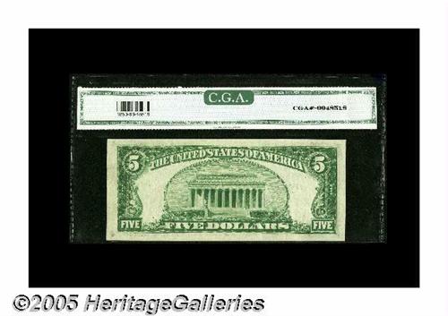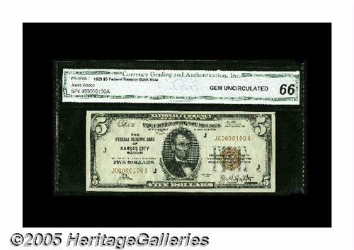 <B>Fr. 1850-J $5 1929 Federal Reserve Bank Note. CGA Gem Uncirculated 66.</B></I><BR>Embossing and wide margins shine through the third-party holder of this KC $5 that sports low serial number 100.