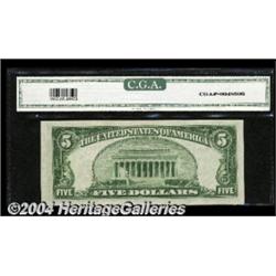 Fr. 1850-J* $5 1929 Federal Reserve Bank Note. Gem Crisp Uncirculated.A nicely centered star example which is one of a short (4 note) run in Oakes, all of which are Uncirculated. These four pieces are the only CU stars listed for the district. This note has been encapsulated by CGA and graded as Gem Uncirculated 65. The Cookson example, which graded only Choice, realized $3680, and this piece will likely do even better. <BR><BR><B>Important notice:</B> Heritage usually auctions material at the rate of 200-250 lots per hour. On some occasions eBay Live bid software or the Internet may not be able to keep up with the pace of the auction. We recommend placing a realistic absentee bid now as insurance to avoid disappointment. Occasionally the auctioneer may eliminate or reject an eBay Live bid, and the auctioneer may also reopen a lot after the close of the eBay live bidding (usually because we missed an audience bid), and may reject your bid even if it shows you as the winning bidder. By bidding via eBay Live, you agree that Heritage may award the lot to another bidder at its sole discretion under the circumstances described above or any other reasonable circumstances. Since eBay bids are not shown to us until we open the lot on the floor, we treat those bids just like floor bids. In most cases the floor responds before the eBay bid is presented to us, due to Internet lag time, so for consistency we have made it a policy that floor bids are always considered first over tie eBay live bids. Also please note that all Heritage lots purchased through eBay Live carry a 20% Buyer's Premium. Please make sure you read the Terms and Conditions before you bid. <BR><BR><B>IMPORTANT ANNOUNCEMENT ABOUT RESERVES:</B> Heritage now divulges all reserves on its web site 7 days before every auction. If you want to know whether the reserve on this lot has been met, and if not, what the reserve amount is, please visit this lot page on the HeritageCoin.com web site, or email: bid@HeritageGalleries.com