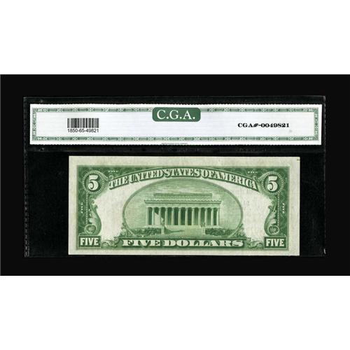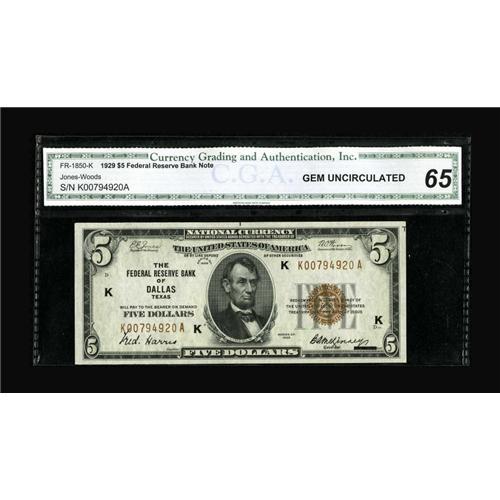 <B>Fr. 1850-K $5 1929 Federal Reserve Bank Note. CGA Gem Uncirculated 65.</B></I><BR>From our 2005 Long Beach sale, "This Dallas FRBN appears fully original and beautifully embossed through the CGA holder, and is well-centered and boldly printed. A lovely Gem example from this popular district."<BR><BR><b>Shipping:</b> Coins & Currency (<a target="_blank" href="http://www.heritageauctions.com/common/shipping.php">view shipping information</a>)
