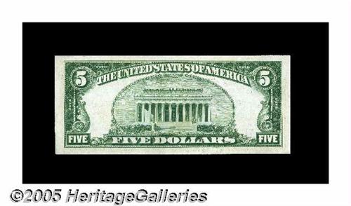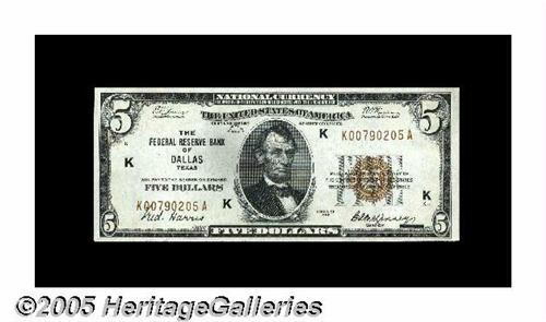 <B>Fr. 1850-K $5 1929 Federal Reserve Bank Note. Choice Crisp Uncirculated.</B></I><BR>The collectors of today are fortunate that William Philpott was able to discover a nice supply of these $5 FRBNs through his contacts with Texas bankers, or Dallas would be the scarcest $5 FRBN.