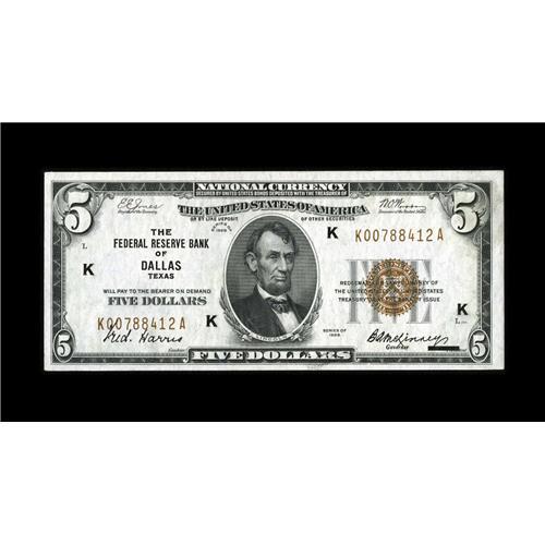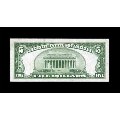 <B>Fr. 1850-K $5 1929 Federal Reserve Bank Note. Very Choice New.</B></I><BR>Surprisingly large margins are noted at top and right, though the other two margins are perfectly sufficient. Pleasing, original embossing and paper are noted.<BR><BR><b>Shipping:</b> Coin/Currency (<a target="_blank" href="http://www.heritageauctions.com/common/shipping.php">view shipping information</a>)