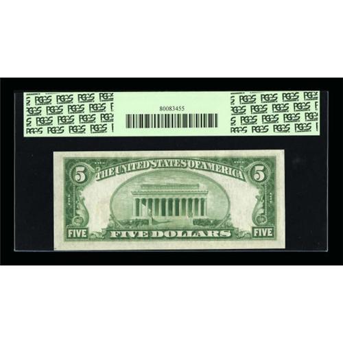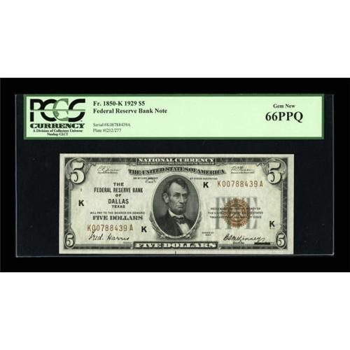 <B>Fr. 1850-K $5 1929 Federal Reserve Bank Note. PCGS Gem New 66PPQ.</B></I><BR> A lovely example of this scarcer Dallas FRBN which has a printing of under one million notes. The margins are broad, the embossing fully punched through on the lettering and the paper surface quality is not to be questioned. The new Schwartz 7th edition lists this at $275 in CU and this is obviously much nicer than that.<BR><I>From The Thomas A. Bergin Collection</B></I><BR><BR><b>Shipping:</b> Coins & Currency (<a target="_blank" href="http://www.heritageauctions.com/common/shipping.php">view shipping information</a>)