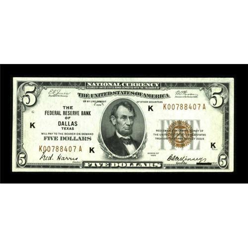 <B>Fr. 1850-K $5 1929 Federal Reserve Bank Note. Very Choice Crisp Uncirculated.</B></I><BR> This Dallas $5 carries fresh, white paper, and bold bank title embossing. This note is on the door step of a higher grade.<BR><BR><b>Shipping:</b> Coins & Currency (<a target="_blank" href="http://www.heritageauctions.com/common/shipping.php">view shipping information</a>)