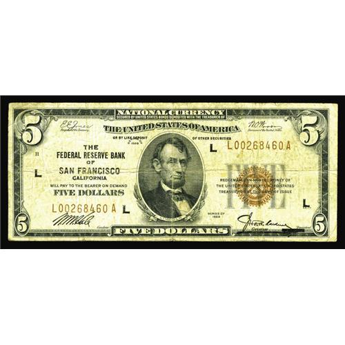 <B>Fr. 1850-L $5 1929 Federal Reserve Bank Note. Very Good-Fine.</B></I><BR>As the key for the $5 FRBNs, the San Fran notes in all grades have been steady performers over the years. Don't make the mistake of buying this note last to finish your $5 FRBN collection.