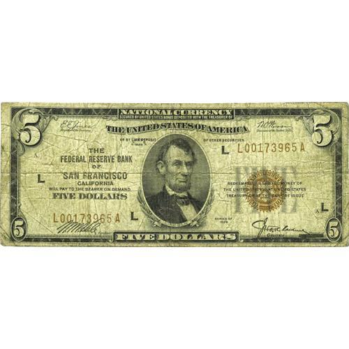 <B>Fr. 1850-L $5 1929 Federal Reserve Bank Note. Very Good.</B></I><BR>The San Francisco district is always in high demand due to its extreme scarcity and there never are enough available to satisfy the appetites of the collecting community.