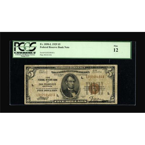 <B>Fr. 1850-L $5 1929 Federal Reserve Bank Note. PCGS Fine 12.</B></I><BR> As the key for the $5 FRBNs, the San Francisco notes in all grades have been steady performers over the years. This is an ideal circulated piece, with even wear and problem free paper.<BR><BR><b>Shipping:</b> Coins & Currency (<a target="_blank" href="http://www.heritageauctions.com/common/shipping.php">view shipping information</a>)