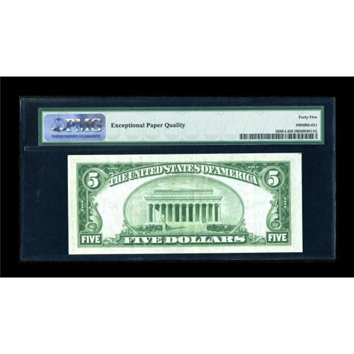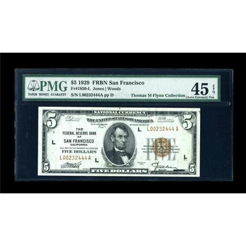 <B>Fr. 1850-L $5 1929 Federal Reserve Bank Note. PMG Choice Extremely Fine 45 EPQ.</B></I><BR> The key to the series and a rare note in any grade above Very Fine. Only one fancy number is known, along with just a literal handful of truly uncirculated examples. This attractive Choice Extremely Fine 45 EPQ could well be the highest grade San Francisco $5 to be offered at public sale for the next few years. <BR><I>From The Thomas M. Flynn Collection</B></I><BR><BR><b>Shipping:</b> Coins & Currency (<a target="_blank" href="http://www.heritageauctions.com/common/shipping.php">view shipping information</a>)