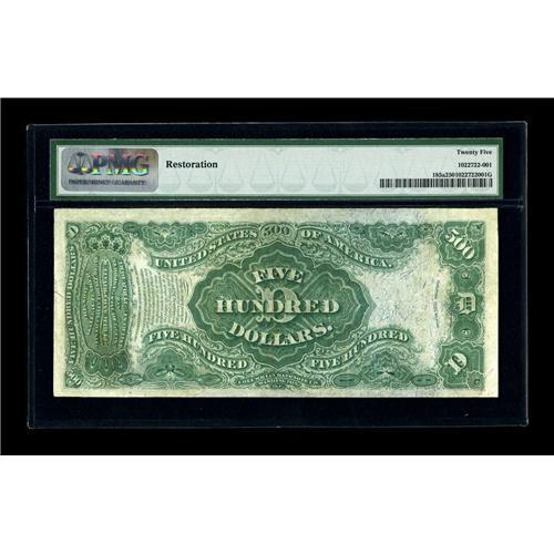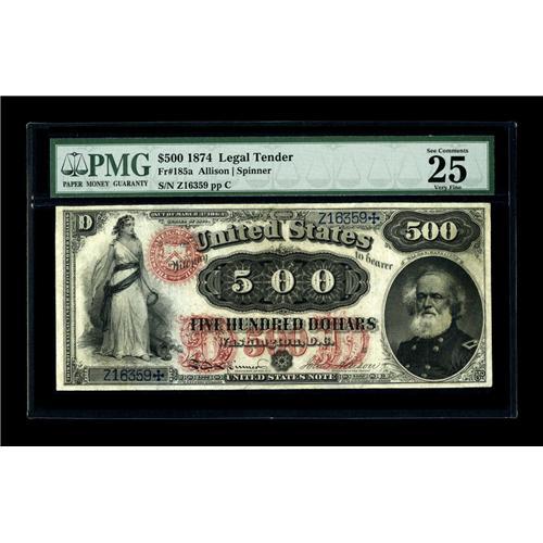 <B>Fr. 185a $500 1874 Legal Tender PMG Very Fine 25.</B></I> This note was introduced to the numismatic community when it appeared in our September 1996 Auction. The discovery increased the number of known Series 1874 pieces to five, though that number is misleading. Two pieces are permanently impounded in the Federal Reserve Bank of Chicago and the Smithsonian Institution and a third is reported but it lacks sale information, its grade is even unknown. The last, and presumably the only other piece in collector's hands, appeared at public auction once; it realized $44,500 in 1983. As a basic type, this note is incredibly scarce. The design encompasses fourteen Friedberg numbers made up of the 1874, 1875, 1878, and 1880 Series' and many different signature combinations. In total those fourteen Friedberg numbers show only thirty six survivors but more than two thirds of the notes are permanently impounded in various museum and government collections, thus only eleven of those specimens are presumably available to collectors.<BR><BR>At left stands the allegorical figure of Victory, her face long and her posture, a state of calm. Below her rests a tipped cannon and unspent cannon balls, the remnants of a war that affected a nation in a way that can never be captured in a single vignette. At right is Major General Joseph K. Mansfield, one of only a few men immortalized on United States currency for their contributions to the Civil War. The power of Charles Burt's design really comes to light with the knowledge of Mansfield's fate. Victory looks to Mansfield who was himself a casualty of the Union victory at Antietam. He was taken in his prime on the bloodiest day in American history where more than 22,000 soldiers were killed or wounded in battle.<BR><BR>Our previous physical description of this incredible Legal Tender rarity included a detailed account of the overall eye appeal, "At a glance, the colors and brightness give the impression of a fully uncirculated note. The seal, the two large red "D's" and the "500" between them are all bright red -- not the annoying pink that so often occurs on 1874 Series notes." PMG's grading opinion includes the comment, "Restoration", though thorough examination of this note reveals little more than a few closed pinholes, a refreshing departure from the heavy repairs usually associated with major currency rarities as well as the other known examples of this type. After years of maturing, this market may only now be able to fully appreciate this rarity.<BR><BR><b>Shipping:</b> Coin/Currency (<a target="_blank" href="http://www.heritageauctions.com/common/shipping.php">view shipping information</a>)