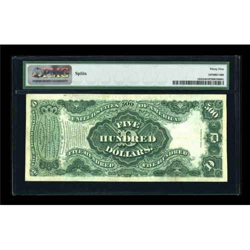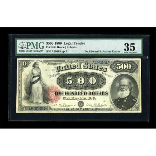 <B>Fr. 185l $500 1880 Legal Tender PMG Choice Very Fine 35.</B></I> Unique in collector's hands, this is one of just five Bruce-Roberts signed $500 Legals to exist. Of the other four, three are in the collections of Federal Reserve Banks, and one resides permanently in the Smithsonian Institution. This piece was originally Lot 179 from the Barney Bluestone November 1944 sale of the Grinnell collection. After that, it was owned by Robert Friedberg, and then Amon Carter. The Dauers acquired the note from the November 1985 Hickman & Oakes sale. This piece is illustrated both sides on page 133 of the Dauers' book, along with a brief biography of General Mansfield, who was killed at the battle of Antietam on September 17, 1862. PMG has noted, "Splits" on their holder, but the splits are wholly within the margins and very minimal. The eye appeal of the note is excellent, the margins are broad, and the colors are bright and pleasing. No collector has had the opportunity to acquire a Fr. 185l in the past 22 years, and, until tonight's buyer decides to sell, no one else will be afforded the opportunity.<I><BR>From The Dr. Edward & Joanne Dauer Collection</B></I><BR><BR><b>Shipping:</b> Coins & Currency (<a target="_blank" href="http://www.heritageauctions.com/common/shipping.php">view shipping information</a>)