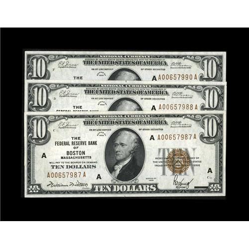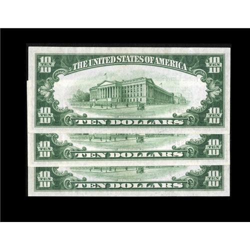 <B>Fr. 1860-A $10 1929 Federal Reserve Bank Note. Three Consecutive Examples. Choice About Uncirculated.</B></I><BR>All three notes in this consecutive run would be full Choice Uncirculated if it were not for a light corner fold on each piece.