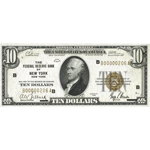 <B>Fr. 1860-B $10 1929 Federal Reserve Bank Note. Choice Crisp Uncirculated.</B></I><BR>A nice example bearing even margins with bright overprints and a bit of light handling. Low serial number 206 also adds a bit of mystique to this piece.