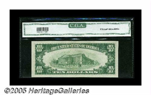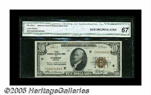 <B>Fr. 1860-E $10 1929 Federal Reserve Bank Note. CGA Gem Uncirculated 67.</B></I><BR>Serial number 9 graces this punch through embossed $10 that is beautifully bright and well centered.