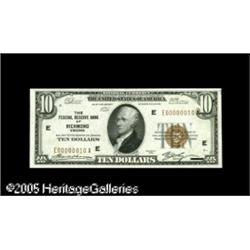 <B>Fr. 1860-E $10 1929 Federal Reserve Bank Note. Gem Crisp Uncirculated.</B></I><BR>A bright and well centered example bearing serial number E00000010A, a perfect mate to the serial number 10 Cleveland note offered above. Lot:15748