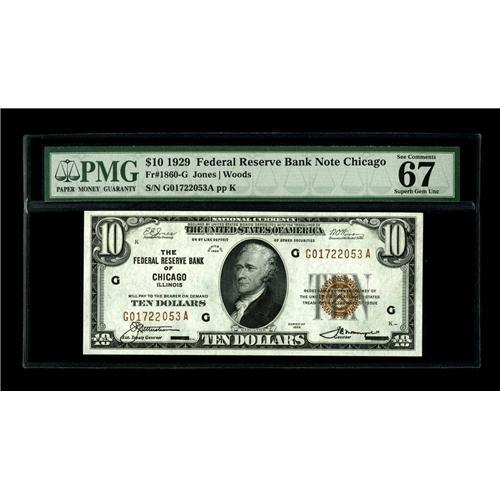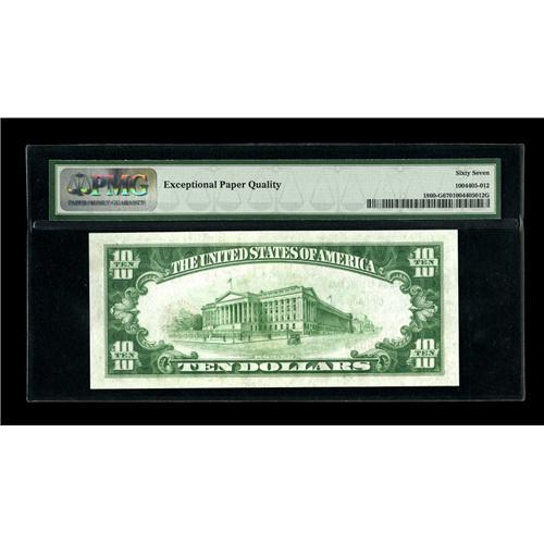 <B>Fr. 1860-G $10 1929 Federal Reserve Bank Note. PMG Superb Gem Unc 67EPQ.</B></I><BR>Incredible margins and plenty of embossing are spotted inside this high grade holder.<BR><BR><b>Shipping:</b> Coin/Currency (<a target="_blank" href="http://www.heritageauctions.com/common/shipping.php">view shipping information</a>)