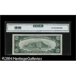 Fr. 1860-H* $10 1929 Federal Reserve Bank Note. CGA Gem <B>Fr. 1860-H* $10 1929 Federal Reserve Bank Note. CGA Gem Uncirculated 65.</B></I><BR>This nice example, the first of two consecutive, has broad, even margins and appears to have fully earned its third party grade. While there are more than 50 known star $10s from the St. Louis district, only two of them in the census grade CU. These two double that census, but more examples aren't likely to appear any time soon. <BR><BR><B>Important notice:</B> Heritage usually auctions material at the rate of 200-250 lots per hour. On some occasions eBay Live bid software or the Internet may not be able to keep up with the pace of the auction. We recommend placing a realistic absentee bid now as insurance to avoid disappointment. Occasionally the auctioneer may eliminate or reject an eBay Live bid, and the auctioneer may also reopen a lot after the close of the eBay live bidding (usually because we missed an audience bid), and may reject your bid even if it shows you as the winning bidder. By bidding via eBay Live, you agree that Heritage may award the lot to another bidder at its sole discretion under the circumstances described above or any other reasonable circumstances. Since eBay bids are not shown to us until we open the lot on the floor, we treat those bids just like floor bids. In most cases the floor responds before the eBay bid is presented to us, due to Internet lag time, so for consistency we have made it a policy that floor bids are always considered first over tie eBay live bids. Also please note that all Heritage lots purchased through eBay Live carry a 20% Buyer's Premium. Please make sure you read the Terms and Conditions before you bid. This lot is being auctioned in conjunction with a live floor auction by Heritage Galleries & Auctioneers. All final auction and invoice information will be supplied by Heritage Galleries & Auctioneers, and all other information should be considered preliminary. Lot:16302