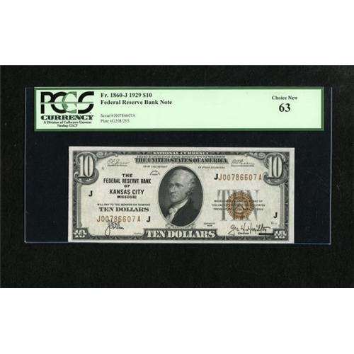 <B>Fr. 1860-J $10 1929 Federal Reserve Bank Note. PCGS Choice New 63.</B></I><BR> An attractive and very well margined example for the grade. A wealth of embossing is visible and the corners are razor sharp.<BR><BR><b>Shipping:</b> Coins & Currency (<a target="_blank" href="http://www.heritageauctions.com/common/shipping.php">view shipping information</a>)