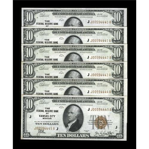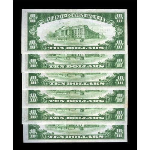<B>Six Consecutive Fr. 1860-J $10 1929 Federal Reserve Bank Notes. Choice About Uncirculated.</B></I><BR> This well margined consecutive run boasts perfectly original embossing and paper quality. Each note displays the same lone centerfold.<BR><BR><b>Shipping:</b> Coins & Currency (<a target="_blank" href="http://www.heritageauctions.com/common/shipping.php">view shipping information</a>)