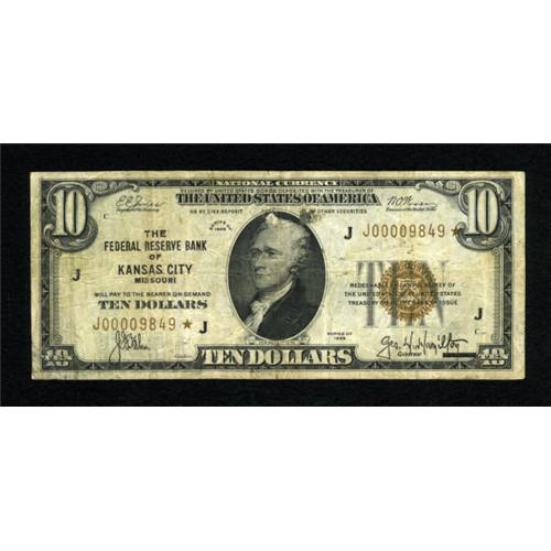 <B>Fr. 1860-J* $10 1929 Federal Reserve Bank Note. Very Good+.</B></I><BR> A few spots and a skin are seen on this Kansas City replacement note.<BR><BR><b>Shipping:</b> Coins & Currency (<a target="_blank" href="http://www.heritageauctions.com/common/shipping.php">view shipping information</a>)