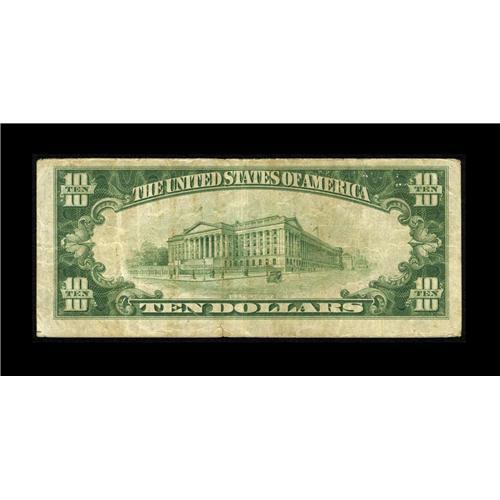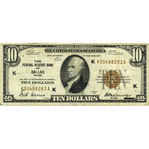 <B>Fr. 1860-K $10 1929 Federal Reserve Bank Note. Fine-Very Fine.</B></I><BR>The key to the $10 Federal Reserve Bank Note issue and a difficult note to obtain in decent condition. A bit of soiling and a slight tear are seen on this well printed example.