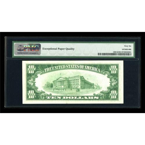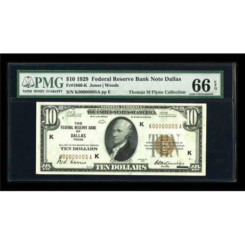 <B>Fr. 1860-K $10 1929 Federal Reserve Bank Note. PMG Gem Uncirculated 66 EPQ.</B></I><BR> The appearance of this note is one of the most highly anticipated items in today's sale, as Tom has owned this note since he purchased it from Amon Carter's estate after Amon's untimely death in 1982. It is one of the great small size rarities, as Dallas district tens are rare in high grade and unheard of in Gem, with Gem examples unpriced in the new small size catalogue. This PMG graded Gem Uncirculated 66 EPQ note is not only the finest example of this note we have ever seen or heard of but carries single digit serial number K00000005A as a bonus, making this one of the very few fancy number Dallas notes available to collectors. PMG has graded only four Dallas tens to date, one Fine, one Very Fine, one Extremely Fine, and this Gem 66. If you are attempting to build the ultimate collection of small size notes, this is a lot you simply must take home today. <BR><I>From The Thomas M. Flynn Collection</B></I><BR><BR><b>Shipping:</b> Coins & Currency (<a target="_blank" href="http://www.heritageauctions.com/common/shipping.php">view shipping information</a>)
