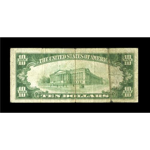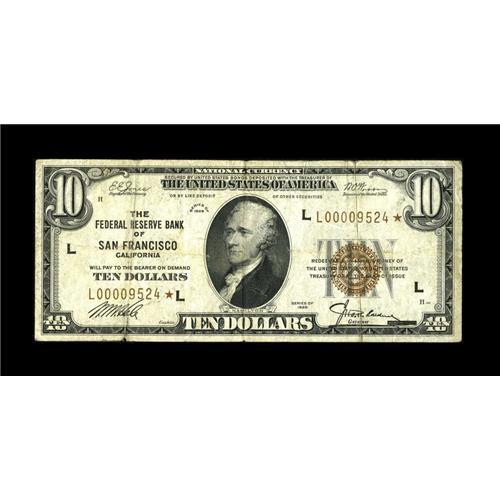 <B>Fr. 1860-L* $10 1929 Federal Reserve Bank Note. Fine.</B></I><BR>This is a tough star to find in any grade, with the new census compiled by Jhon Cybuski showing just seventeen examples, with only one grading higher than Very Fine. This piece shows a couple of tiny separations at the folds, along with a bit of soil on one section of the reverse.<BR><BR><b>Shipping:</b> Coins & Currency (<a target="_blank" href="http://www.heritageauctions.com/common/shipping.php">view shipping information</a>)