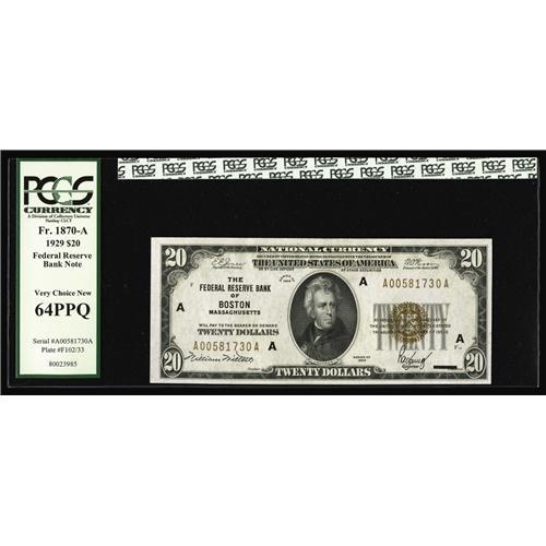 <B>Fr. 1870-A $20 1929 Federal Reserve Bank Note. PCGS Very Choice New 64PPQ.</B></I><BR>With a touch more right margin this certainly would have been a Gem delivering bright white paper and well inked surfaces. Boston FRBN's don't show up very often this nice.