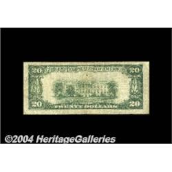 Fr. 1870-B* $20 1929 Federal Reserve Bank Note. Fine.A perfectly natural example of this scarce star, with nice margins and unexpectedly good color for the grade. An ideal note for the budget-conscious collector who wants a nice circulated example to fill a hole in a specialized star set. Only 24,000 star notes were printed in this short printing. <BR><BR><B>Important notice:</B> Heritage usually auctions material at the rate of 200-250 lots per hour. On some occasions eBay Live bid software or the Internet may not be able to keep up with the pace of the auction. We recommend placing a realistic absentee bid now as insurance to avoid disappointment. Occasionally the auctioneer may eliminate or reject an eBay Live bid, and the auctioneer may also reopen a lot after the close of the eBay live bidding (usually because we missed an audience bid), and may reject your bid even if it shows you as the winning bidder. By bidding via eBay Live, you agree that Heritage may award the lot to another bidder at its sole discretion under the circumstances described above or any other reasonable circumstances. Since eBay bids are not shown to us until we open the lot on the floor, we treat those bids just like floor bids. In most cases the floor responds before the eBay bid is presented to us, due to Internet lag time, so for consistency we have made it a policy that floor bids are always considered first over tie eBay live bids. Also please note that all Heritage lots purchased through eBay Live carry a 20% Buyer's Premium. Please make sure you read the Terms and Conditions before you bid. <BR><BR><B>IMPORTANT ANNOUNCEMENT ABOUT RESERVES:</B> Heritage now divulges all reserves on its web site 7 days before every auction. If you want to know whether the reserve on this lot has been met, and if not, what the reserve amount is, please visit this lot page on the HeritageCoin.com web site, or email: bid@HeritageGalleries.com