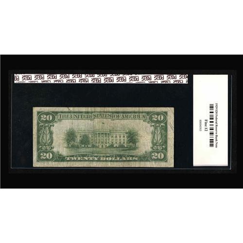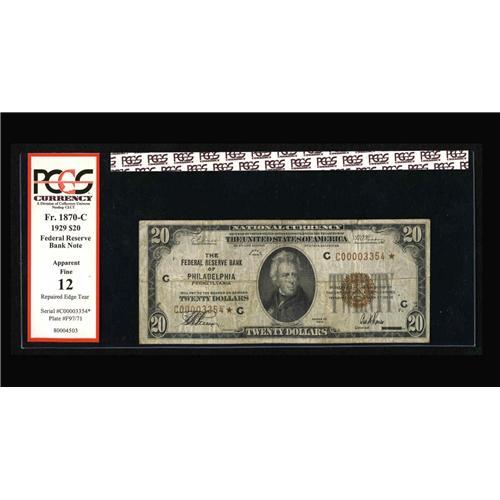 <B>Fr. 1870-C* $20 1929 Federal Reserve Bank Note. PCGS Apparent Fine 12.</B></I><BR>A top edge tear has been repaired on this Philly Star that is sheltered in a red PCGS label holder. This $20 could satisfy the demands of a type or district collector of FRBNs.