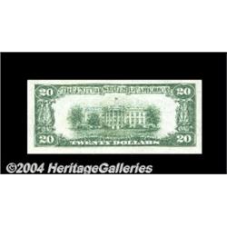 Fr. 1870-D $20 1929 Federal Reserve Bank Note. Gem Crisp Uncirculated.Nicely centered, beautifully embossed, and utterly original. <BR><BR><B>Important notice:</B> Heritage usually auctions material at the rate of 200-250 lots per hour. On some occasions eBay Live bid software or the Internet may not be able to keep up with the pace of the auction. We recommend placing a realistic absentee bid now as insurance to avoid disappointment. Occasionally the auctioneer may eliminate or reject an eBay Live bid, and the auctioneer may also reopen a lot after the close of the eBay live bidding (usually because we missed an audience bid), and may reject your bid even if it shows you as the winning bidder. By bidding via eBay Live, you agree that Heritage may award the lot to another bidder at its sole discretion under the circumstances described above or any other reasonable circumstances. Since eBay bids are not shown to us until we open the lot on the floor, we treat those bids just like floor bids. In most cases the floor responds before the eBay bid is presented to us, due to Internet lag time, so for consistency we have made it a policy that floor bids are always considered first over tie eBay live bids. Also please note that all Heritage lots purchased through eBay Live carry a 20% Buyer's Premium. Please make sure you read the Terms and Conditions before you bid. <BR><BR><B>IMPORTANT ANNOUNCEMENT ABOUT RESERVES:</B> Heritage now divulges all reserves on its web site 7 days before every auction. If you want to know whether the reserve on this lot has been met, and if not, what the reserve amount is, please visit this lot page on the HeritageCoin.com web site, or email: bid@HeritageGalleries.com