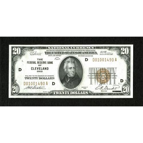 <B>Fr. 1870-D $20 1929 Federal Reserve Bank Note. PCGS Very Choice New 64.</B></I><BR> This lovely Cleveland $20 faces up like a Gem note printed on bright paper and having ample margins.<BR><BR><b>Shipping:</b> Coins & Currency (<a target="_blank" href="http://www.heritageauctions.com/common/shipping.php">view shipping information</a>)