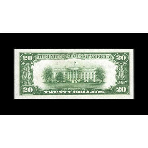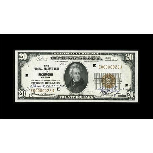 <B>Fr. 1870-E $20 1929 Federal Reserve Bank Note. Gem Crisp Uncirculated.</B></I><BR>A beautiful note which was likely a presentation piece, as it is double autographed by both the Cashier and the Governor of the Richmond branch of the Federal Reserve Bank over their printed signatures. The note has a pedigree going back to Donlon's 1951 auction sale, thence to the Fantastic Collection, and was finally sold by us to Dr. Lawrence Cookson in our November, 1995 auction. This piece, bearing serial number E00000023A, is as nice as they come, combining perfect centering on both face and back with bright white paper and vivid ink colors. Expect some stiff competition before the hammer falls on this treasure, likely in the range of...