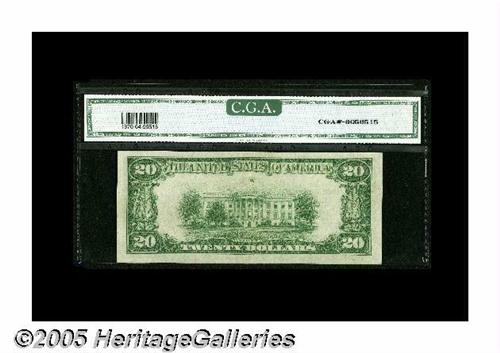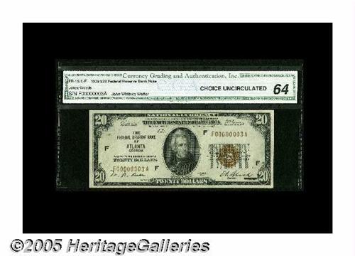 <B>Fr. 1870-F $20 1929 Federal Reserve Bank Note. CGA Choice Uncirculated 64.</B></I><BR>Atlanta is one of the scarcer districts, especially in this grade. The addition of the single digit serial makes this example a special prize.<BR><I>Ex-John Whitney Walter.</B></I>