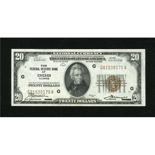 <B>Fr. 1870-G $20 1929 Federal Reserve Bank Note. Choice Crisp Uncirculated.</B></I><BR>Sizeable margins and bold embossing are found on this Chicago FRBN which would grade as a gem but for a small nick in the top border.<BR><BR><b>Shipping:</b> Coins & Currency (<a target="_blank" href="http://www.heritageauctions.com/common/shipping.php">view shipping information</a>)
