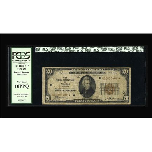 <B>Fr. 1870-G* $20 1929 Federal Reserve Bank Note. PCGS Very Good 10PPQ.</B></I><BR>According to the census of FRBN Stars, this is one of just 14 $20 Chicago Stars. It last traded hands for over $2000 in June 2003.