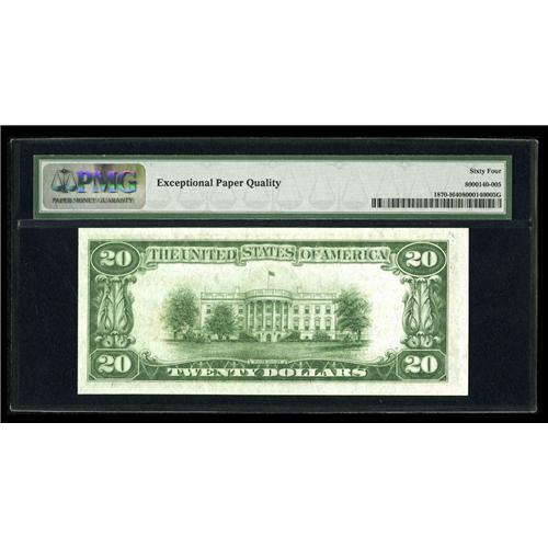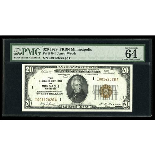 <B>Fr. 1870-I $20 1929 Federal Reserve Bank Note. PMG Choice Uncirculated 64.</B></I><BR>This is as nice a Minneapolis Brown Seal as you will see. It is a touch tight at upper left.