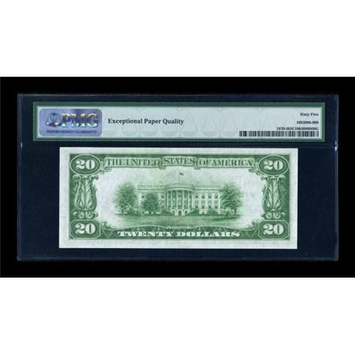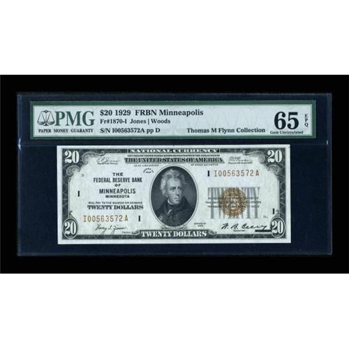 <B>Fr. 1870-I $20 1929 Federal Reserve Bank Note. PMG Gem Uncirculated 65 EPQ.</B></I><BR> A well centered and hugely embossed Minneapolis district example. <BR><I>From The Thomas M. Flynn Collection</B></I><BR><BR><b>Shipping:</b> Coins & Currency (<a target="_blank" href="http://www.heritageauctions.com/common/shipping.php">view shipping information</a>)