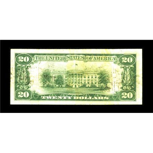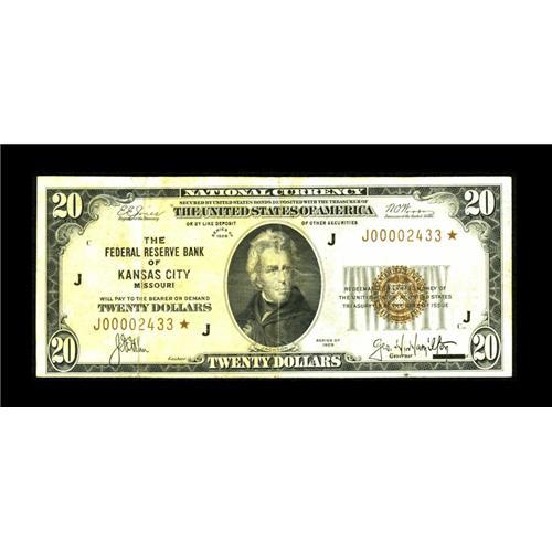 <B>Fr. 1870-J* $20 1929 Federal Reserve Bank Note. Fine-Very Fine.</B></I><BR>This piece, which retains some crispness, is lightly stained with a touch of soiling on the back. Only 24 survivors are enumerated in the Cybuski census out of a print run of 24,000.<BR><BR><b>Shipping:</b> Coins & Currency (<a target="_blank" href="http://www.heritageauctions.com/common/shipping.php">view shipping information</a>)