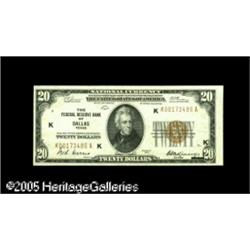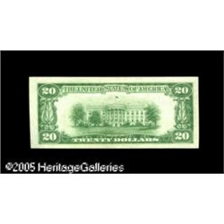<B>Fr. 1870-K $20 1929 Federal Reserve Bank Note. Crisp Uncirculated.</B></I><BR>Dean Oakes calls this note the "real key to the series," meaning the entire regular issue series in all denominations in uncirculated condition, where his monograph lists just three such examples. While the centering here certainly isn't perfect and the note displays a small corner tip fold along with some handling, it is bright, fully original, and quite new. Expect considerable bidding before the hammer drops on this lot, likely in the range of... Lot:15774