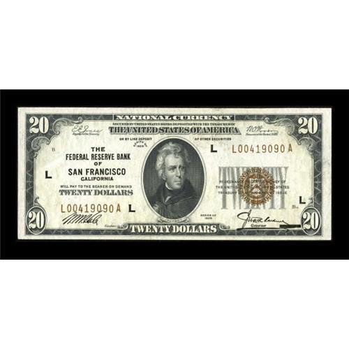 <B>Fr. 1870-L $20 1929 Federal Reserve Bank Note. Choice About Uncirculated.</B></I><BR> Only a light vertical fold prevents a Choice grade on this wonderfully original San Francisco $20 FRBN that lists for $750 in CU in the Schwartz & Lindquist reference. <BR><BR><b>Shipping:</b> Coins & Currency (<a target="_blank" href="http://www.heritageauctions.com/common/shipping.php">view shipping information</a>)