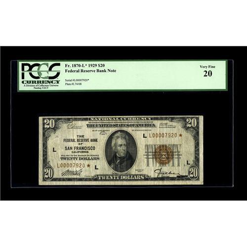 <B>Fr. 1870-L* $20 1929 Federal Reserve Bank Note. PCGS Very Fine 20.</B></I><BR>One of the most sought after notes in the 1929 FRBN series as a star, this San Francisco note has the added enhancement of certification by PCGS. Our FUN 2005 auction included an uncertified Fine-Very Fine (L0007242*) just a tad away from this note in overall eye appeal. It sold for $8,050. Our 2004 FUN sale sold the Cookson specimen (L00004103*), a Fine-Very Fine that went for $5,750. Prior to that, our 2003 FUN auction placed a Fine with somewhat discolored paper (L00007217*) for $2,472.50. This new discovery gives us the unprecedented privilege of being able to offer one of these excessively rare San Francisco FRBN stars once again at our Florida United Numismatists auction. Although all are within a half grade or so of each other, we deem this example to be the most aesthetically pleasing. With interest in rare stars at an all time high, we anticipate a furious contest to determine which collection will be distinguished by the addition of this rarity to its ranks. While any estimate for such a rare and sought after item necessarily engenders a considerable degree of speculation, we anticipate that the final range will be...<BR><BR><b>Shipping:</b> Coin/Currency (<a target="_blank" href="http://www.heritageauctions.com/common/shipping.php">view shipping information</a>)