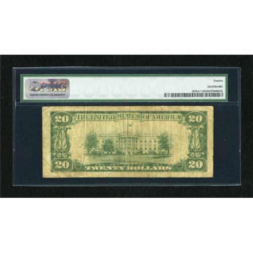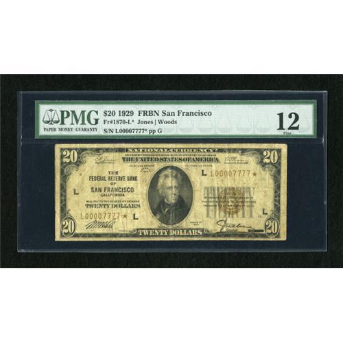 <B>Fr. 1870-L* $20 1929 Federal Reserve Bank Note. PMG Fine 12.</B></I><BR> This is an extremely rare note in any grade and brings the total number of examples known to six. It has solid margins and is helped along by its fancy serial number L00007777*. This same example sold in our 2007 FUN Signature Sale for a hair over $4,000 and we would expect a similar result in today's very strong marketplace.<BR><BR><b>Shipping:</b> Coins & Currency (<a target="_blank" href="http://www.heritageauctions.com/common/shipping.php">view shipping information</a>)