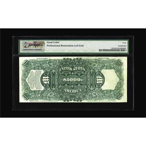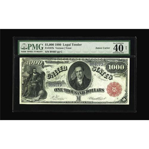 <B>Fr. 187k $1000 1880 Legal Tender PMG Extremely Fine 40.</B></I> Only four examples of this number are known, two of which are forever off the market in government hands. One of those is in the holdings of the Federal Reserve Bank of New York, and the second is the Hessler illustration note which is now in the Smithsonian Institution. All four notes in the census grade VF or EF, with this piece and the Smithsonian example the EF's. This note is the better of the only two pieces that will ever be available to collectors. It's a solid EF with the eye appeal of a fully uncirculated piece. As noted in the census and on the PMG holder the note has a well done restoration in the left margin area. PMG has placed two comments on their holder, "Good Color" and "Professional Restoration Left End". The work has been done with such skill that visual detection is all but impossible. 1880 thousands are rare as a type, and the appearance of any example on the market is noticed by all advanced collectors. When one does appear, it is almost always the "common" (14 known) Fr.187j. This great note, which is reaching the market at a time when great notes are being sought after by more than the usual small group of collectors, could easily reach, and quite likely exceed...