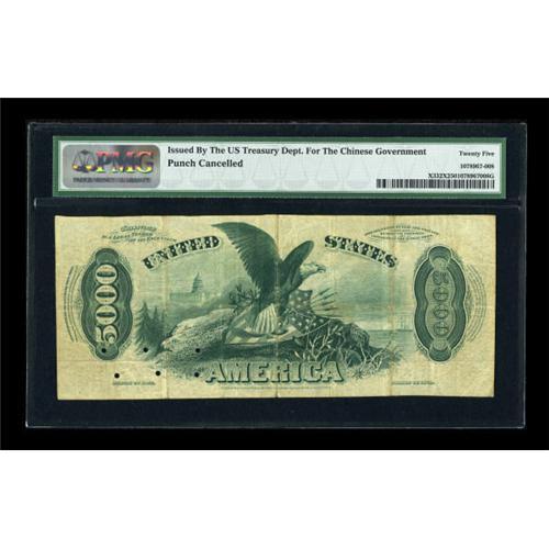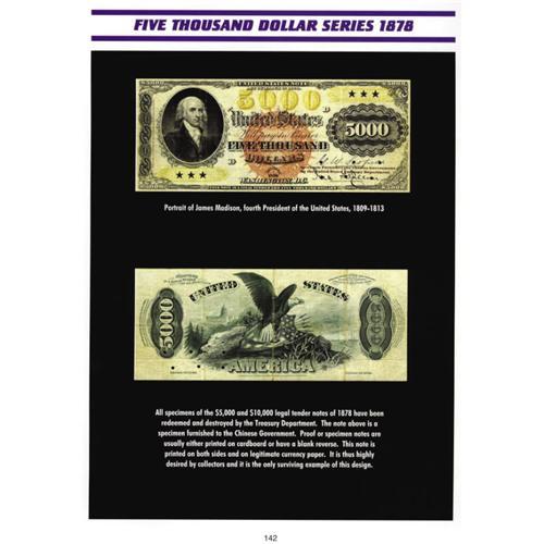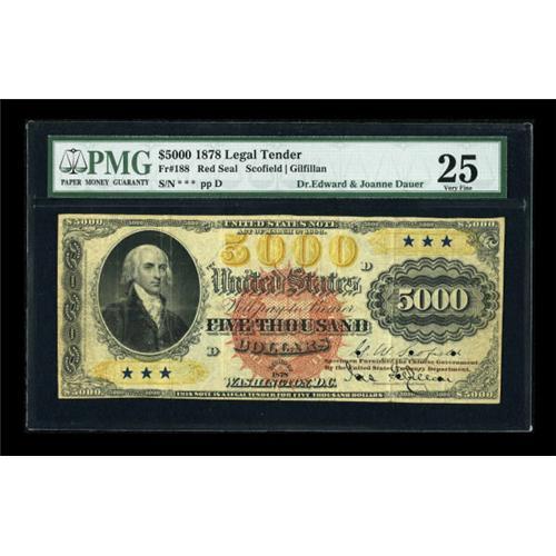 <B>Fr. 188 $5000 1878 Legal Tender PMG Very Fine 25.</B></I> Certainly the key piece in this offering of Legal Tenders, and one of the key pieces in all of Federal currency. The Dauers have illustrated both sides of this note on page 142 of their <I>American History As Seen Through Currency</B></I>. Along with the photos comes the following caption: "All the $5,000 and $10,000 Legal Tender notes of 1878 have been redeemed and destroyed by the Treasury Department. The note above is a specimen furnished to the Chinese Government. Proof or specimen notes are usually either printed on cardboard or have a blank reverse. This note is printed on both sides and on legitimate currency paper. It is thus highly desired by collectors and it is the only surviving example of this design." <BR>All of the above is wholly correct, but there is considerably more to tell. This note has only three minor differences from the regular issue: three stars fill each serial number box, each signature has three small cancels, and the Chinese Government presentation is overprinted between the signatures. Save for that, it is a totally legitimate piece of currency. It is also the only $5,000 Large Size note of any issue or design that is available to the collecting public. To our knowledge, there are no other Large Size notes of any denomination in this category. The note is more akin to a sample than a specimen. Whatever category you place this note in, it is an irreplaceable part of US currency history and the key to assembling a complete set of U.S. currency by Friedberg number. <BR><I>From The Dr. Edward & Joanne Dauer Collection</B></I><BR><BR><b>Shipping:</b> Coins & Currency (<a target="_blank" href="http://www.heritageauctions.com/common/shipping.php">view shipping information</a>)